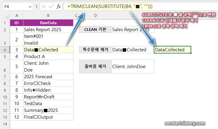 꿀팁: 특정 특수문자를 자주 만나면, SUBSTITUTE로 해당 문자를 빈 문자열("")로 바꾼 뒤 CLEAN 을 적용하세요. 지금은 불필요하지만, 양쪽 공백까지 제거하려면 TRIM 함수도 중첩합니다. 확실한 데이터만을 남기죠.