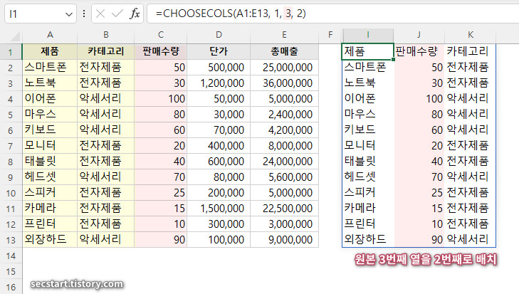 설명: 1번째(제품), 3번째(판매수량), 2번째(카테고리) 열을 선택해요. 순서를 바꾸어 재조합 할 수 있어요.
