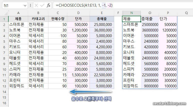 =CHOOSECOLS(A1:E13, 1, 5)→ 제품과 총매출만 추출.