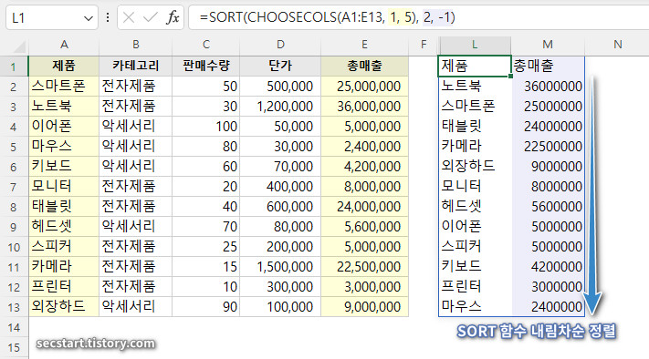 설명: 엑셀 CHOOSECOLS 함수로 제품과 총매출 열만을 선택 추출한 뒤, SORT 함수로 매출(2번째 열) 을 기준으로 내림차순(-1) 으로 정렬해요.