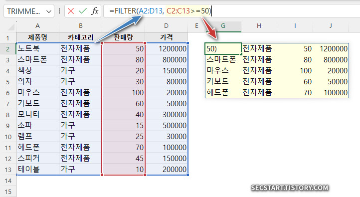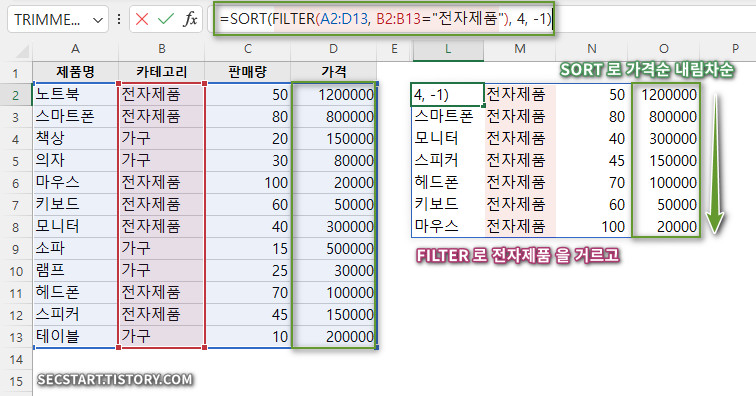 풀이: FILTER 함수가 카테고리를 전자제품으로 제한하고, SORT 함수가 '가격' 순 내림차순 정렬. 이 수식이 L2 에 입력 > 엔터키 > 범위로 동적 확장