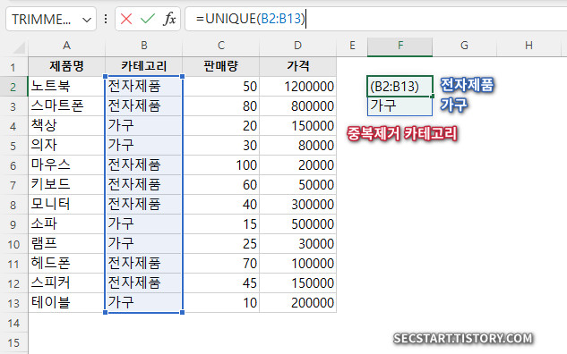 풀이: F2 단일 셀에 수식을 입력했지만 중복 제거되고 남은값은 '전자제품'과 '가구', 2개여서 SPILL(동적확장) 됩니다.
