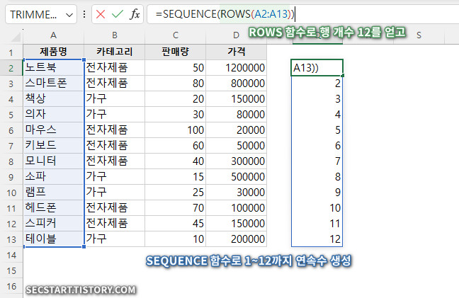 풀이: ROWS 함수가 범위의 행 수를 얻고, 그 수를 받은 SEQUENCE 함수가 그 행 수 만큼의 연속 수를 만들어 동적배열로 뿌려줘요.