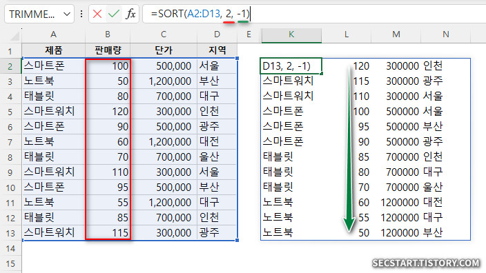 K2 셀에 입력하면 SORT 함수로 판매량 기준 내림차순 정렬된 데이터가 출력돼요.