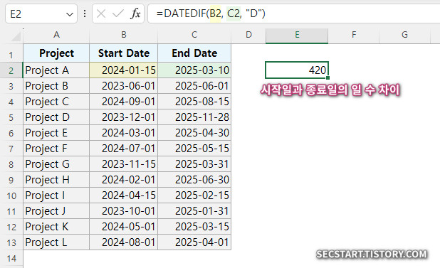 시작일 B2와 종료일 C2의 일수 차이 420일, 함수 없는 단순식으로 =C2-B2 로도 같은 결과를 얻습니다.