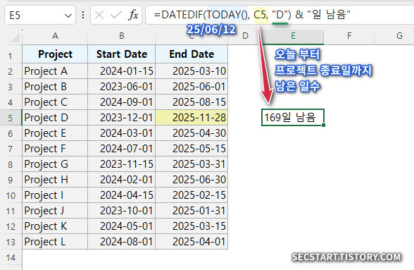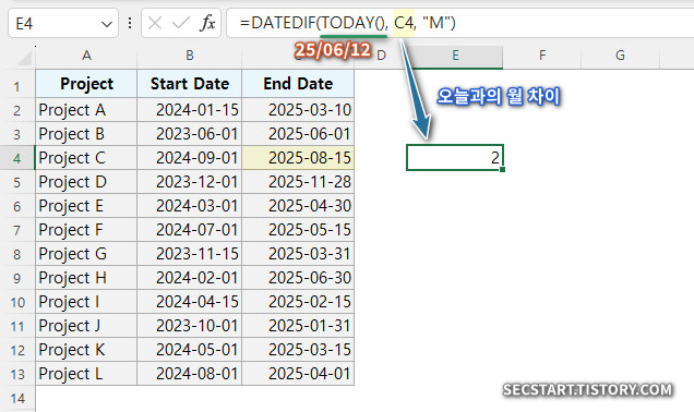 오늘 날짜를 시작일로 하여 프로젝트 C 가 종료하는 날짜까지 2개월이 남아있다는 DATEDIF 함수식.