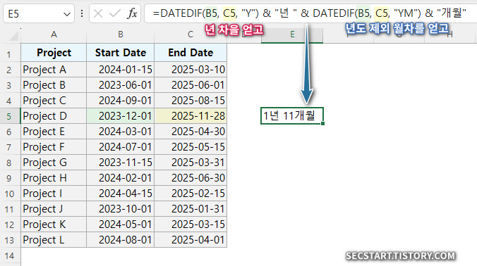 =DATEDIF(B5, C5, "Y") & "년 " & DATEDIF(B5, C5, "YM") & "개월"