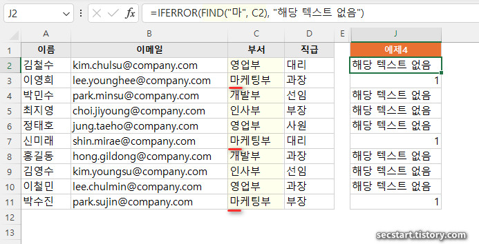 =IFERROR(FIND("마", C2), "해당 텍스트 없음")
