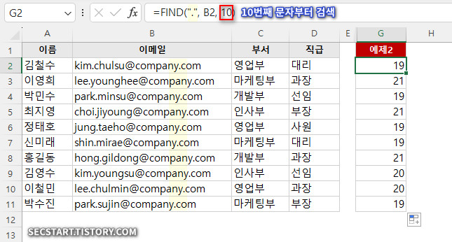 이 수식은 10번째 위치부터 "." 문자를 찾습니다. 그래서 앞쪽의 "."은 검색되지 않아요. 이메일에서 도메인 부분의 점을 찾을 때 유용해요.