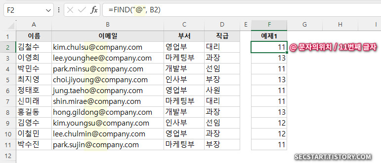 이 함수식은 이메일 주소에서 "@" 기호의 위치를 찾아줍니다. kim.chulsu@company.com 에서 "@" 는 11번째 위치에 있어요.