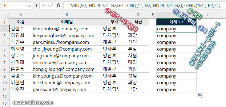 FIND 함수로 시작위치와 추출문자수를 얻어 MID 함수로 도메인만을 추출합니다.
