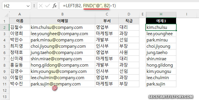 이 수식은 FIND 와 LEFT 함수를 조합해서 "@" 앞의 사용자명만 추출합니다.