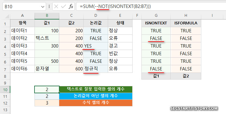 - =SUM(--NOT(ISNONTEXT(B2:B7))) → 텍스트로 잘못 입력한 셀의 개수, ISNONTEXT 결과는 숫자와 공백 셀
