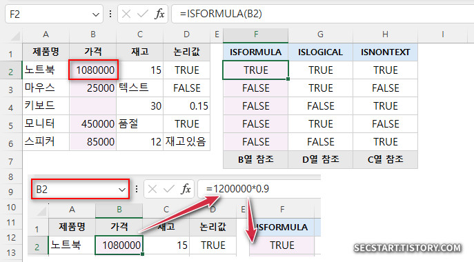 - =ISFORMULA(B2) → TRUE (수식 셀)