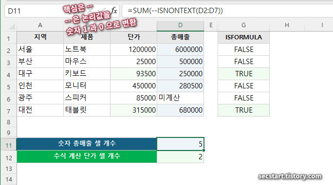 - =SUM(--ISNONTEXT(D2:D7)) → 숫자 총매출 개수