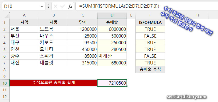 - =SUM(IF(ISFORMULA(D2:D7),D2:D7,0)) → 수식으로 계산된 매출 합계