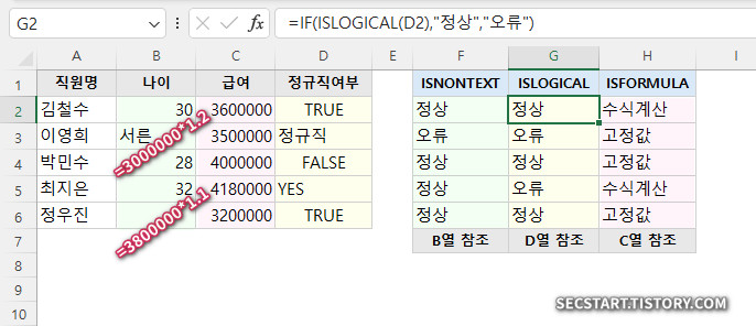 - =IF(ISLOGICAL(D2),"정상","오류") → 정규직 여부 검증(논리값만 "정상")