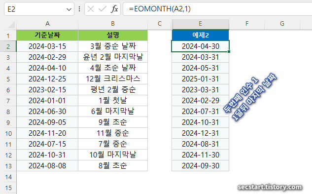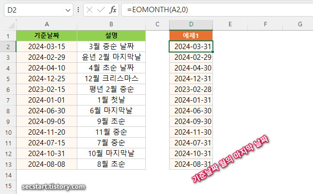 📌 NOTE: EOMONTH 함수는 윤년을 자동으로 고려하여 2월의 경우도 정확하게 28일 또는 29일을 반환합니다. 또한 31일이 없는 달의 경우도 정확하게 처리해줘요.