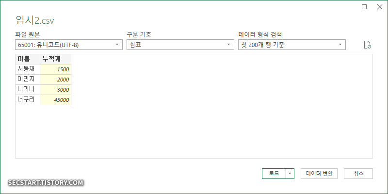 데이터 탭 > 데이터 가져오기 > 파일에서 > 텍스트/CSV 에서 메뉴를 클릭하고 위의 CSV 파일을 가져오면 미리보기 창이 보입니다.