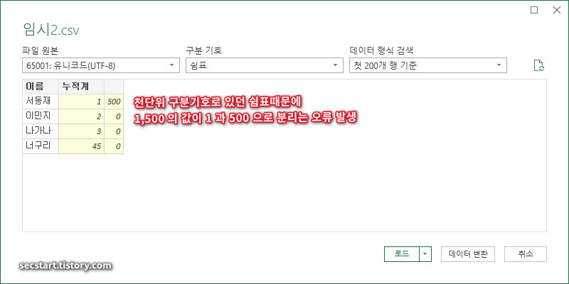 오늘 게시물의 목적이 보이지요. 이를 해결하는 방법은 원본데이터 수정에 있어요. 원본데이터 숫자 부분을 쌍따옴표로 묶어줍니다.