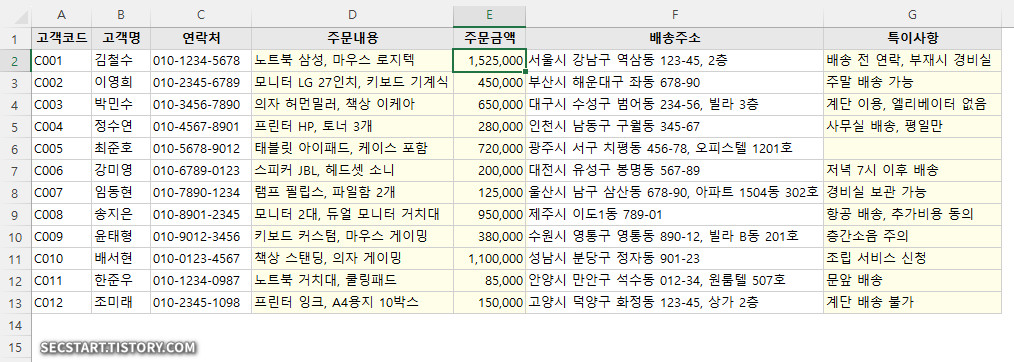 고객코드,고객명,연락처,주문내용,주문금액,배송주소,특이사항