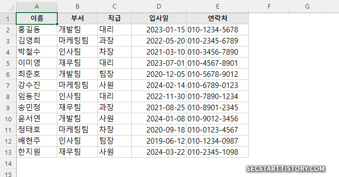 홍길동,개발팀,대리,2023-01-15,010-1234-5678