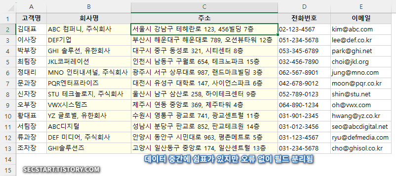 여기서는 회사명과 주소에 쉼표가 포함되어 있어서 따옴표로 묶여있어요. 이런 경우 엑셀이 자동으로 인식해서 처리해줍니다.
