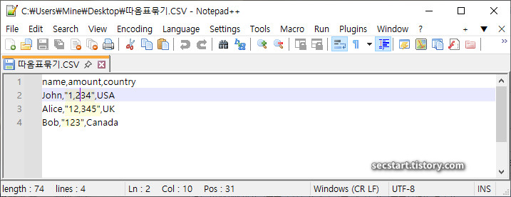 여기서는 전체적인 CSV 파일 컴마 숫자 따옴표 묶는 방법의 흐름만 느끼세요. 세부적인것은 갈수록 자세요.