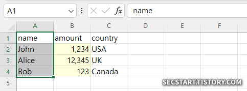아래의 샘플 CSV 의 amount 필드는 천단위 구분기호 컴마를 포함하고 있어요. 그냥 엑셀로 가져오면 분리되겠지요. 이를 따옴표로 묶어 봅니다. 2-1의 단계를 밟아 갑니다.