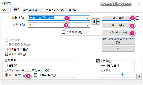 - 찾을 내용: (\d{1,3}(,\d{3})*) //이 정규식은 천단위 컴마가 포함된 숫자(예: 1, 1,234, 123,456,789)를 매칭.