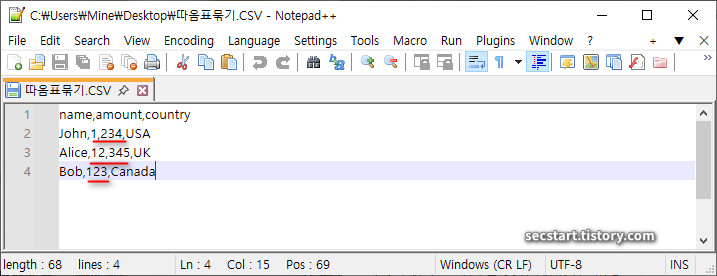 ㄱ. 파일 열기: Notepad++로 CSV 파일을 엽니다.