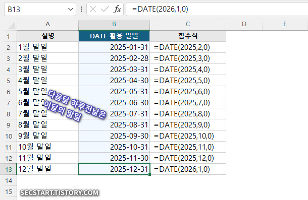 - =DATE(2025,13,1) → 2026년 1월 1일 (12개월을 넘어서 다음 해로)