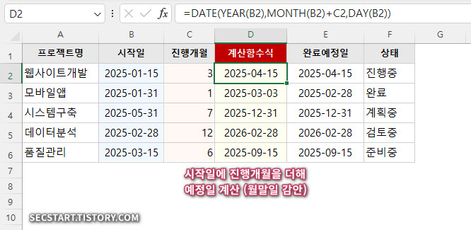 프로젝트명,시작일,진행개월,계산함수식,완료예정일,상태