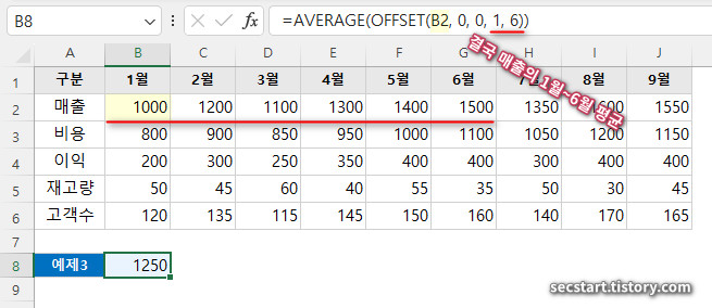 실무에서는 이런 식으로 특정 행의 데이터를 동적으로 분석할 때 OFFSET을 자주 사용해요. 예제3의 COUNTA 함수를 [너비] 인수에 활용하면 월이 추가되어도 자동으로 평균이 계산됩니다.