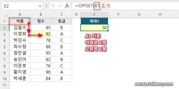 결과: 92 (A1에서 2행 아래, 1열 오른쪽인 B3 셀의 값)