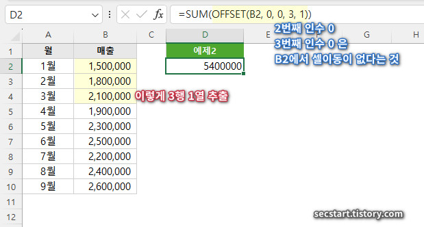 이 수식은 B2 셀부터 시작해서 3행 1열 범위(B2:B4)의 합계를 구합니다. 4번째 [높이] 인수를 변수로 설정하면 범위를 고정하지 않고 동적으로 지정할 수 있어서 유용해요.