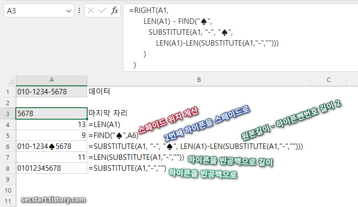 ㄹ. SUBSTITUTE(A1, "-", "♠", ..... : SUBSTITUTE 함수로 2번째 하이픈을 ♠ 로 변환