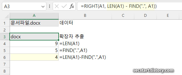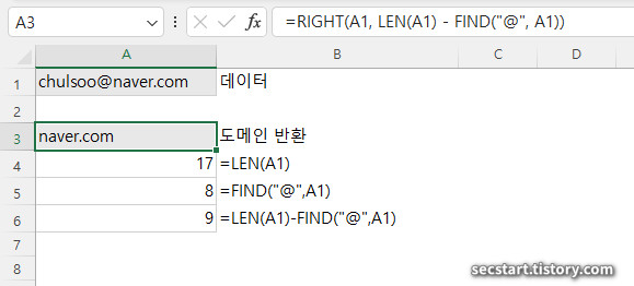 - RIGHT 조합: 뒤에서부터 개수를 세야 하므로 전체 길이(LEN 함수)에서 구분자 위치를 빼야 함