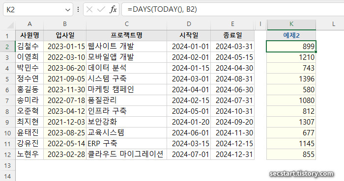 TODAY 함수와 조합하여 각 사원의 현재까지 근무일수를 실시간으로 계산할 수 있어요. 인사팀에서 연차 계산이나 근속연수 산정 시 매우 유용합니다.
