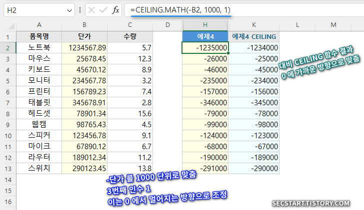 음수 단가를 1000원 단위로 올림할 때 사용해요. 모드를 1로 설정하면 0에서 멀어지는 방향으로 올림돼요. 대비값인 K열의 CEILING 함수 결과는 0 에 가까운 방향으로 음수가 맞춰집니다.