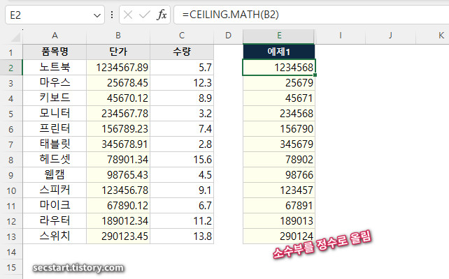 가장 기본적인 사용법이에요. 2번째 인수가 생략되어 기본값 1 이 적용되고, 이는 1의 배수로 올림이다.