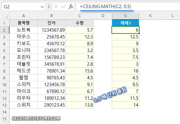 수량 5.7을 0.5 단위로 올림해서 6.0이 반환돼요. 재고 관리나 포장 단위 계산에 활용할 수 있어요.