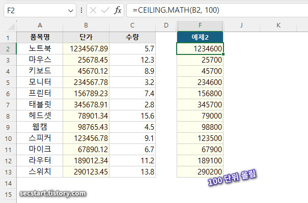 실무에서 자주 사용하는 방식이에요. 단가를 100원 단위로 올림해서 1234600이 반환돼요. 가격 책정할 때 정말 유용하죠.