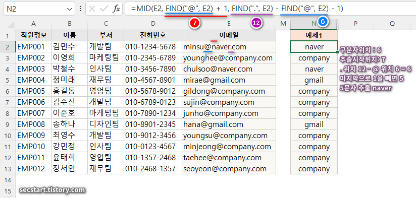 ㄴ. =MID(이메일, 구분자1(@)위치+1, 구분자2(.)위치-구분자1(@)위치 - 1) // 이것이 MID + FIND 함수조합의 기본