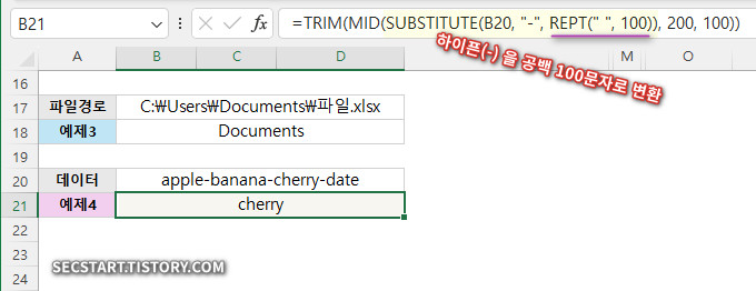 ㄴ. SUBSTITUTE( B20, "-", .... ) : B20 문자열에서 하이픈(-) 을 찾아 " " 100개로 변환.