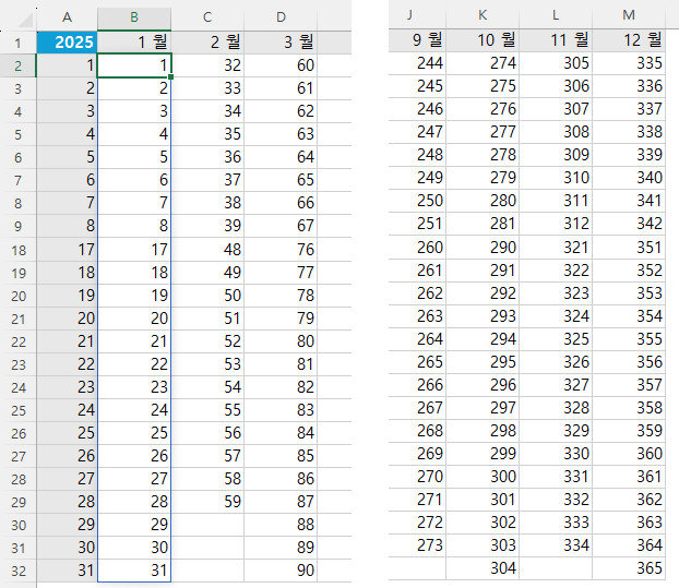- DATE( $A$1, B1, 1) : 2025년 1월 1일 생성, 년도는 절대참조로 고정( 이후 수식복사를 위해 )
