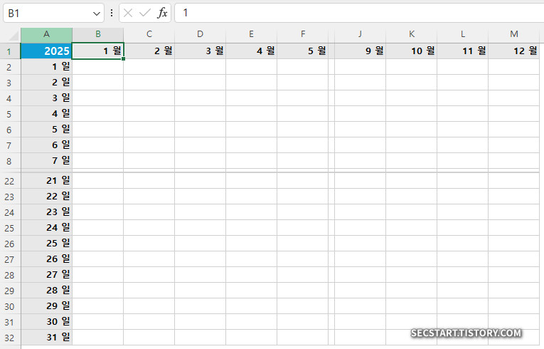 먼저 기본 틀을 만들어보세요: 열머리글은 월별로, 행머리글은 일별로 작성해요