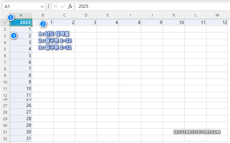 Step 1 📅 A1에 연도, B1 ~ M1에 월(1 ~ 12) 입력