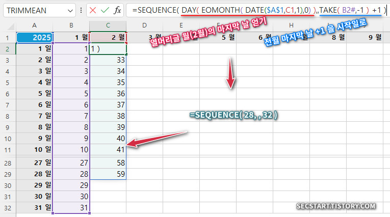Step 3 🔄 C2에 =SEQUENCE( DAY( EOMONTH( DATE($A$1,C1,1), 0 )),,TAKE( B2#, -1) +1 ) 입력