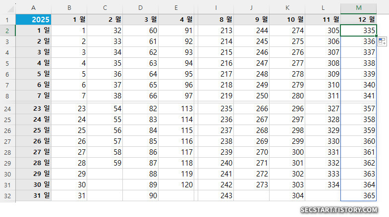 이렇게 줄리안 달력 (Julian Date Calendar | Julian Day) 이 완성됩니다.